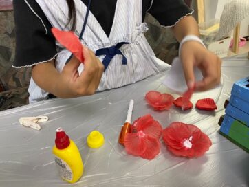 立体作品では花びらの紙を重ねてお花を作ったり、写真立てや