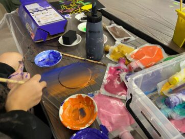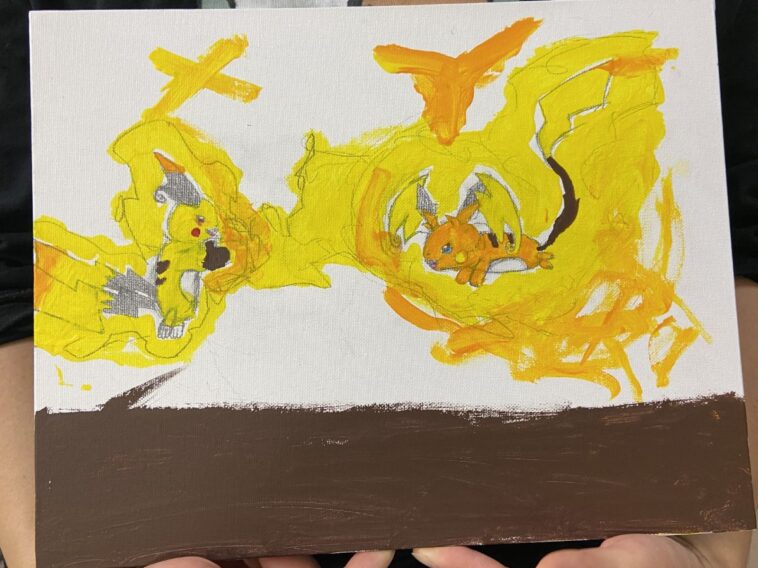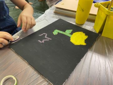キャンバス画の子たちはテーマに沿ってマスキングテープで描いたり