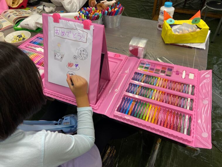 お絵描きセットを買ってもらって嬉しかったようで、教室でお披露目。