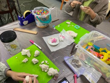 自由工作ではロケットと発射台をセットで制作したり粘土で動物を作ったり