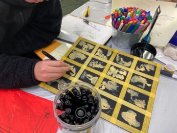 お絵描き組は大きなキャンバスをマスキングテープで分割して