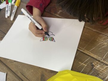 顔をお面に直接描く子もいれば、別の紙に描いて切り貼りする子も。