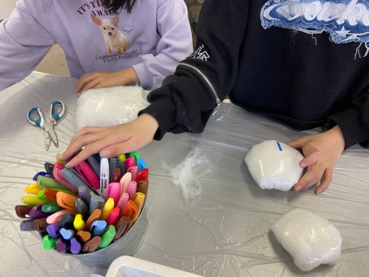 女の子たちはラップやペンを使って簡易スクイーズ作り。