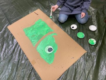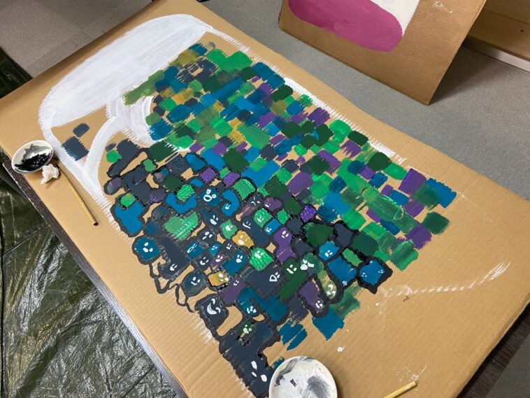 次回、絵の具が乾いてから段ボールカッターで切り抜いて完成です。